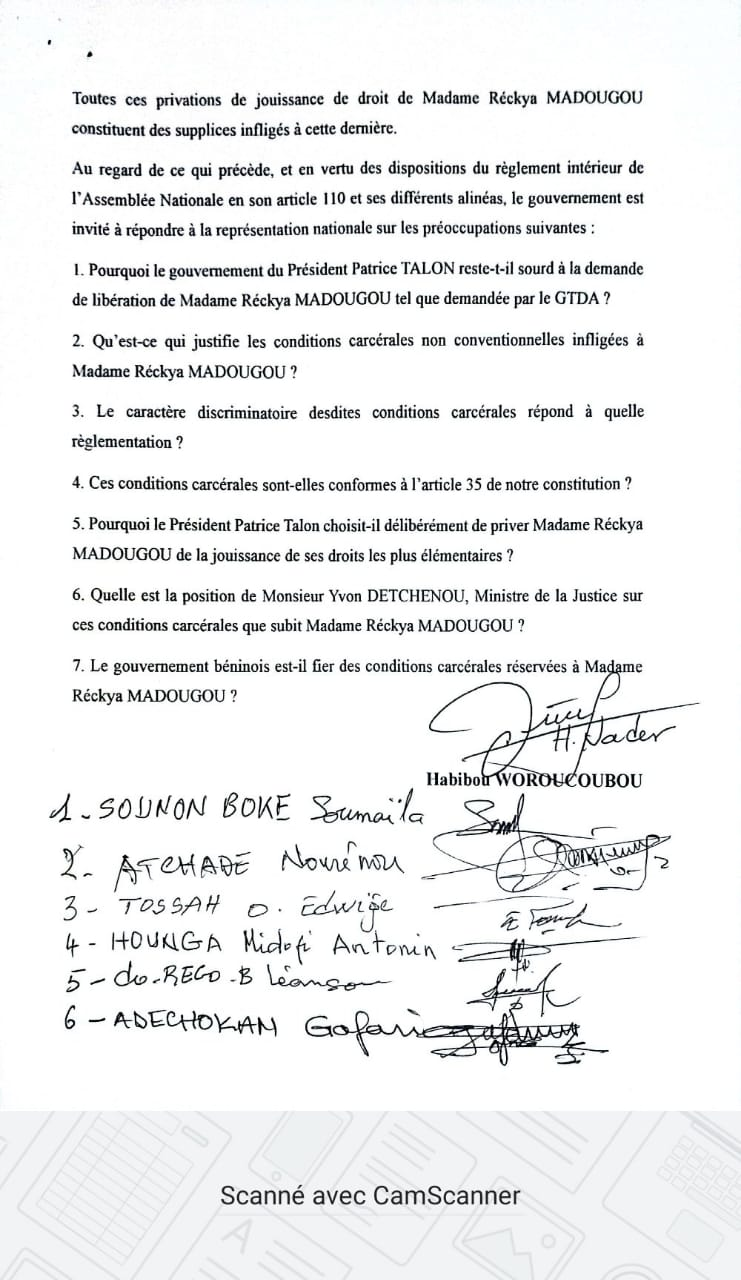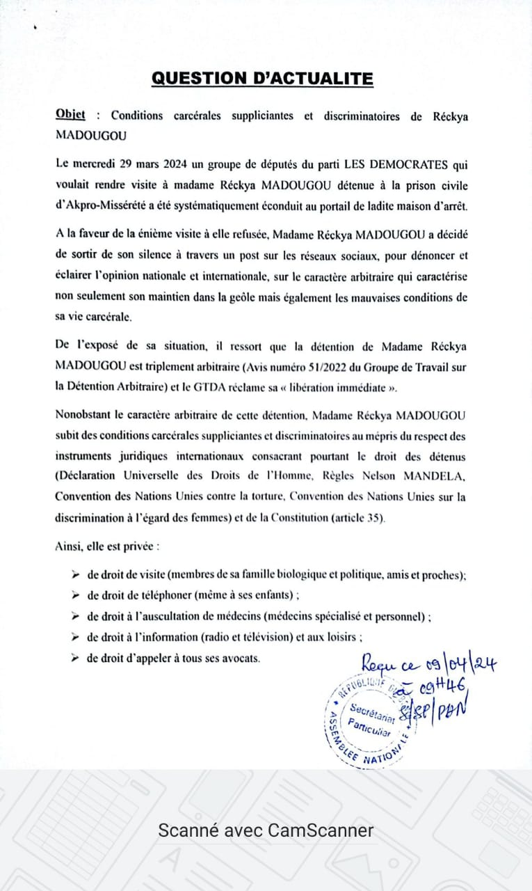 Au Parlement du Bénin, le député du parti de l’opposition « Les Démocrates », Habibou Woroucoubou et six autres de ses collègues ont soumis sept questions au gouvernement concernant les conditions carcérales de Reckya Madougou et ses critiques à l’égard du pouvoir de Patrice Talon.