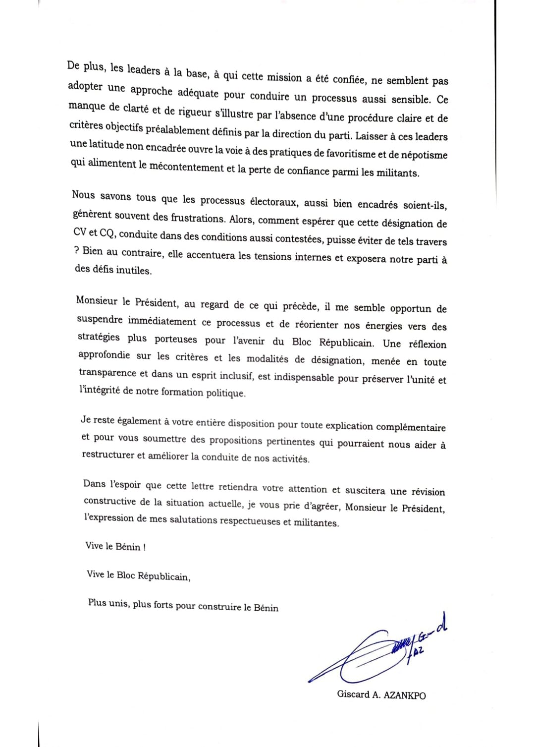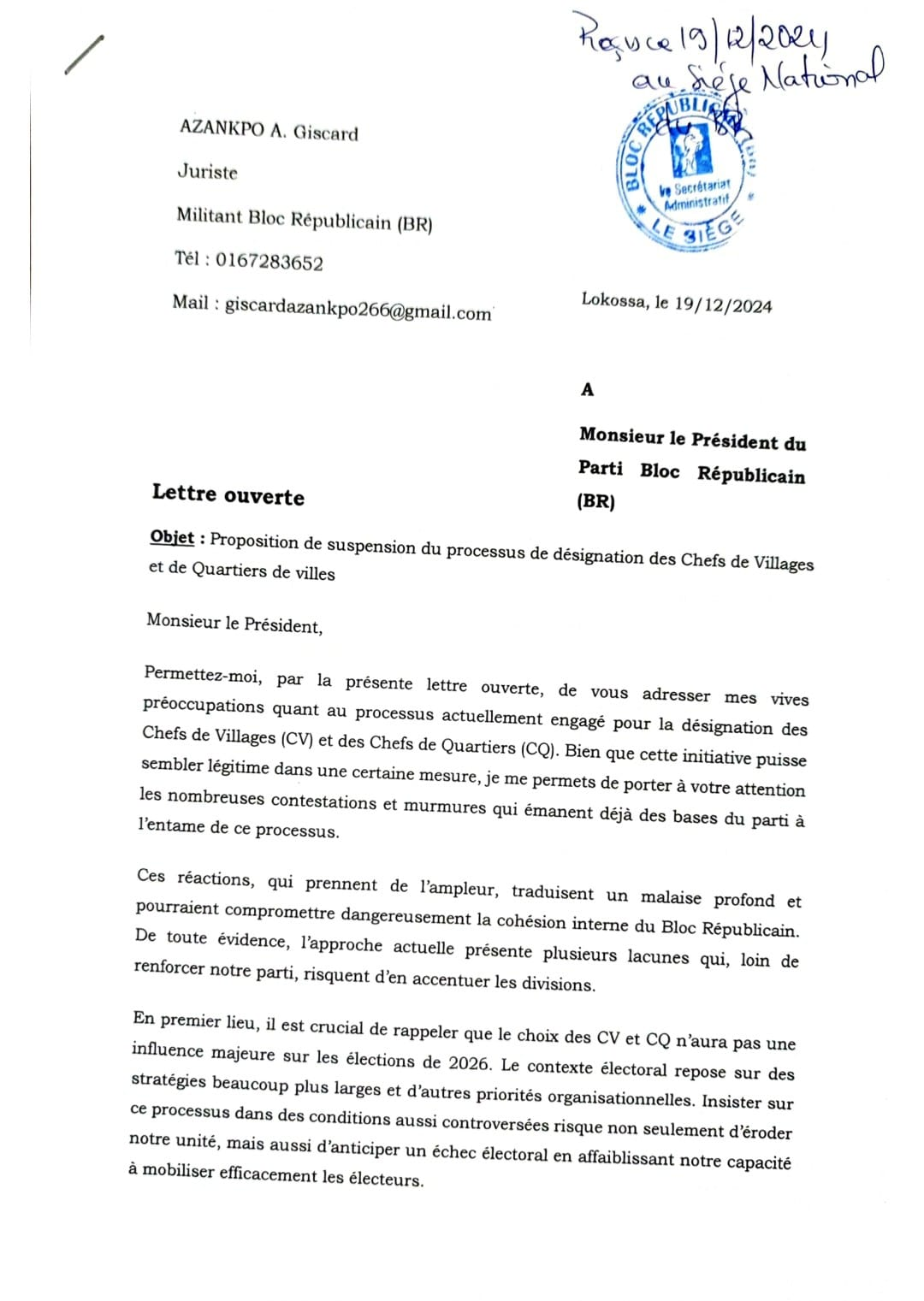 Un militant influent du Bloc Républicain a publié une lettre ouverte adressée au Président du parti, dénonçant le processus en cours de désignation des Chefs de Villages (CV) et des Chefs de Quartiers (CQ).