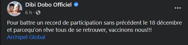 Beaucoup de fans de l’interprète du fameux hit à succès « Le Temps », s’activent déjà afin d’y prendre part. Et c’est d’ailleurs, ce qui a poussé le chanteur béninois Francisco Marc Gbedjekan, connu plus sous le pseudonyme professionnel Dibi Dobo a lancé un important appel aux internautes qui pensent être de la partie. En effet, à travers une publication sur sa page Facebook officielle, il invité ces derniers à se faire vacciner contre la Covid-19. « Pour battre un record de participation sans précédent le 18 décembre et parcequ’on rêve tous de se retrouver, vaccinons nous!!! », a écrit Dibi Dobo sur Facebook.