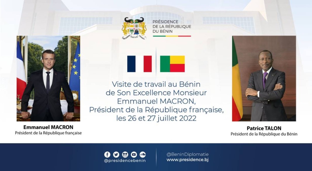 Le président français Emmanuel Macron déroule depuis quelques minutes son agenda au Bénin. Arrivé dans la nuit du mardi 26 juillet 2022, il est actuellement au Palais de la Marina et tient comme l’indique son chronogramme, un entretien avec le président béninois Patrice Talon.