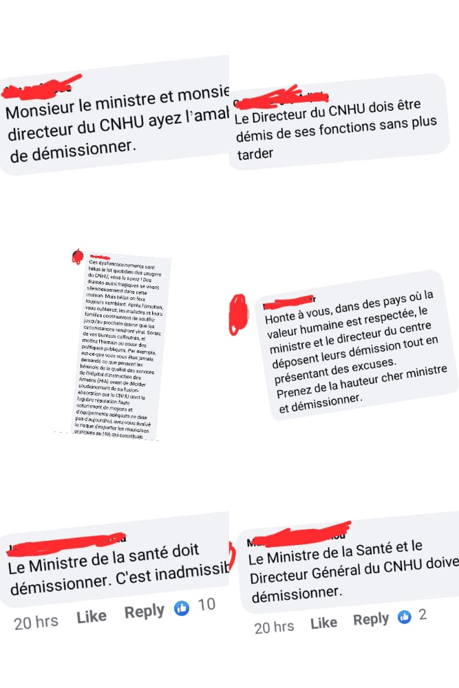 Sur la toile, le gouvernement et surtout le Ministre de la Santé est pris en sandwich. Au cœur de commentaires acerbe et parfois désobligeant, Benjamin Hounkpatin est invité à rendre les clés de son département ministériel. « Le ministre de la santé doit démissionner, c’est une honte », a écrit un internaute suite à la publication du communiqué signé de Benjamin Hounkpatin sur la situation.