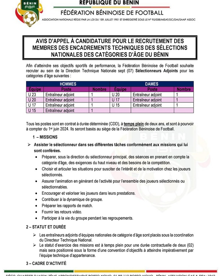 Tous les postes sont en contrat à durée déterminée (CDD), à temps plein de deux ans, et sont à pourvoir à compter du 1er juin 2024. Ils seront basés au siège de la Fédération Béninoise de Football.