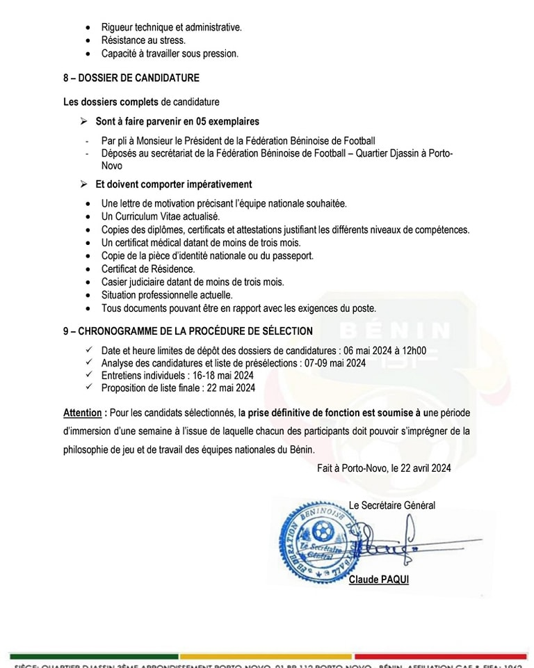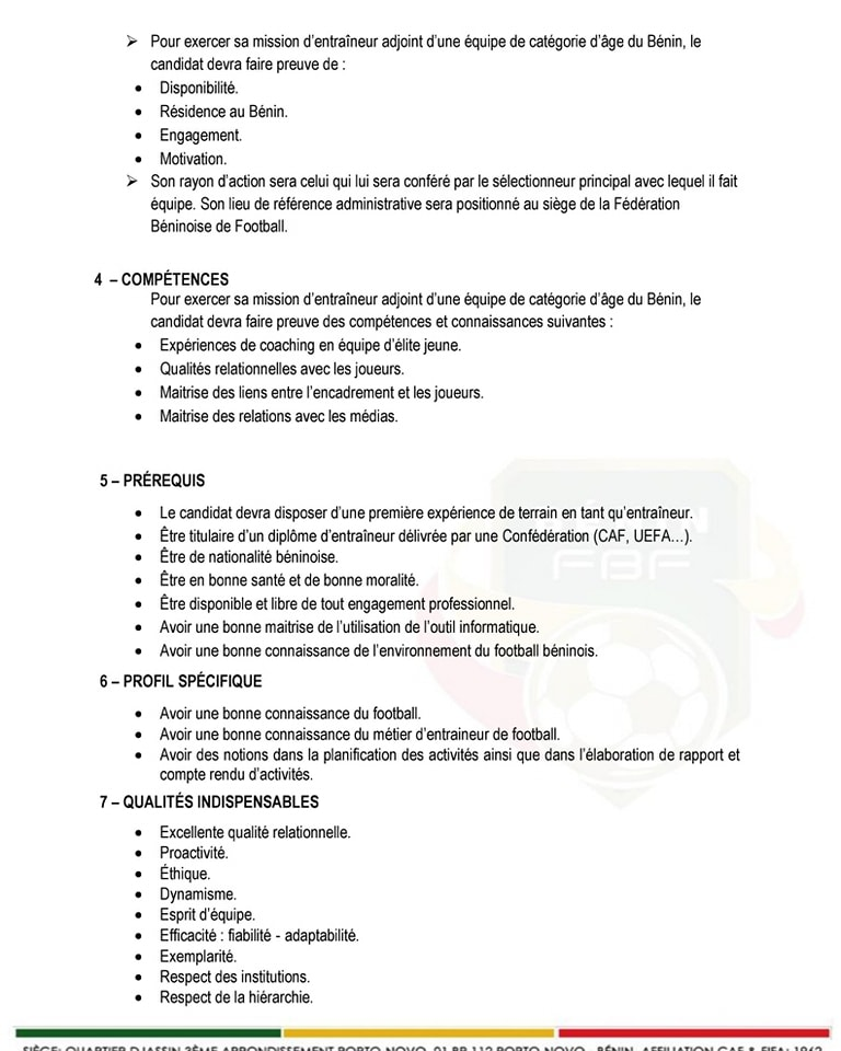 Pour les candidats sélectionnés, la prise définitive de fonction est soumise à une période d’immersion d’une semaine, à l’issue de laquelle chacun des participants doit pouvoir s’imprégner de la philosophie de jeu et de travail des équipes nationales du Bénin. Voici les détails de l’offre !
