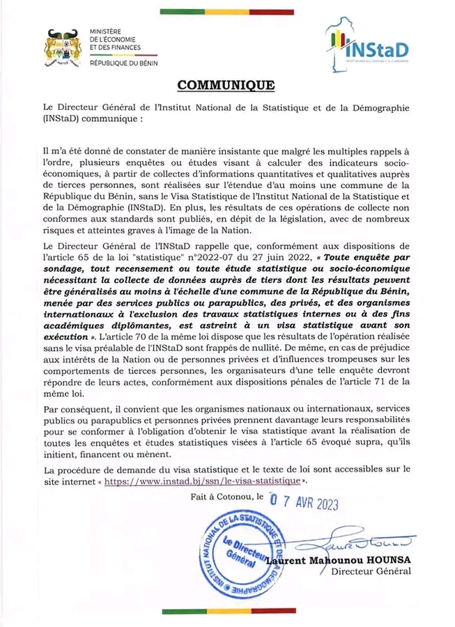 Bénin: important communiqué de l’INStaD sur les enquêtes sans visa statistique