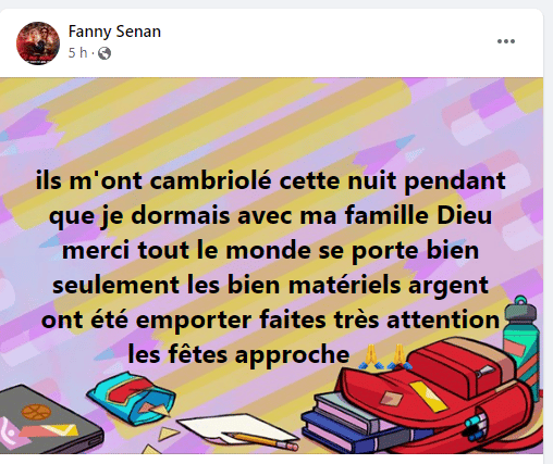 « Dieu merci tout le monde se porte bien seulement les bien matériels argent ont été emporter faites très attention, les fêtes approchent », a-t-elle ajouté.