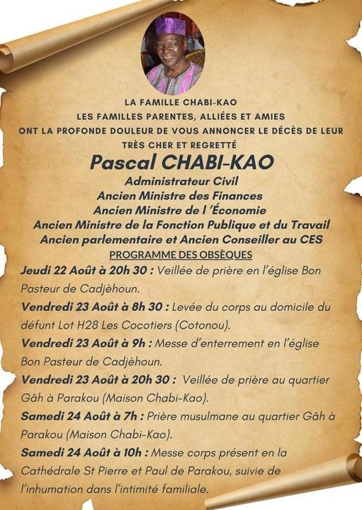 Décédé le lundi 5 août 2024, dans son domicile à Cotonou, l’ancien ministre des Finances béninois, Pascal Chabi Kao sera inhumé le samedi 24 août 2024.