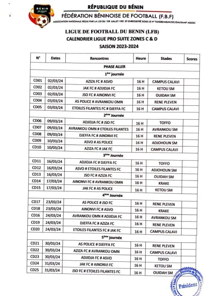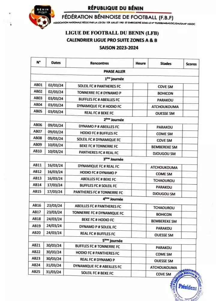Après la Super Ligue Pro, c’est au tour de la Ligue Pro Suite de prendre son vol. Réservée aux équipes échouée à rejoindre l’élite du foot béninois, la compétition aura lieu du 2 mars au 12 mai prochain. Au total, 20 clubs répartis dans deux zones (A-B et C-D) de 10 équipes vont prendre part à ce mini marathon de foot.
