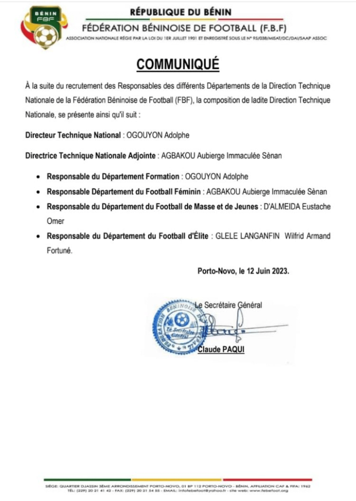 - Responsable du Département du Football d’Elite: Wilfrid Armand Fortuné Glele Langanfin