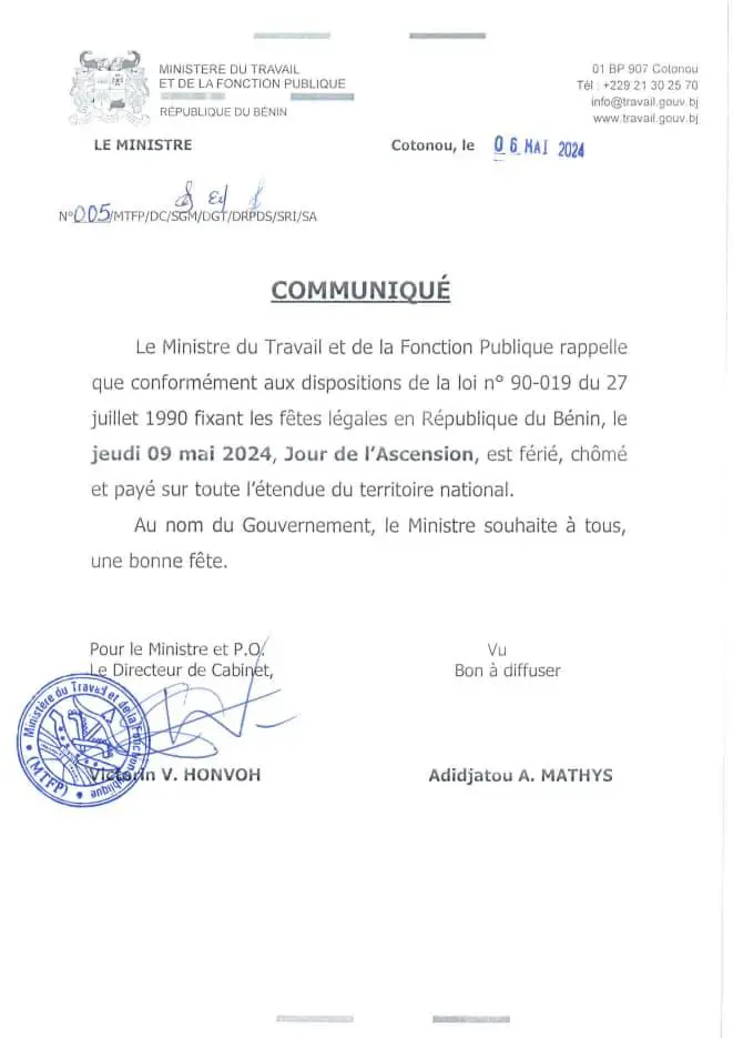 En raison de la célébration de la fête chrétienne « Ascension », la journée du jeudi 09 mai 2024 est déclarée fériée, chômée et payée sur toute l’étendue du territoire national. L’information est rendue publique à travers un communiqué de la ministre du travail, signé le lundi 06 mai 2024.