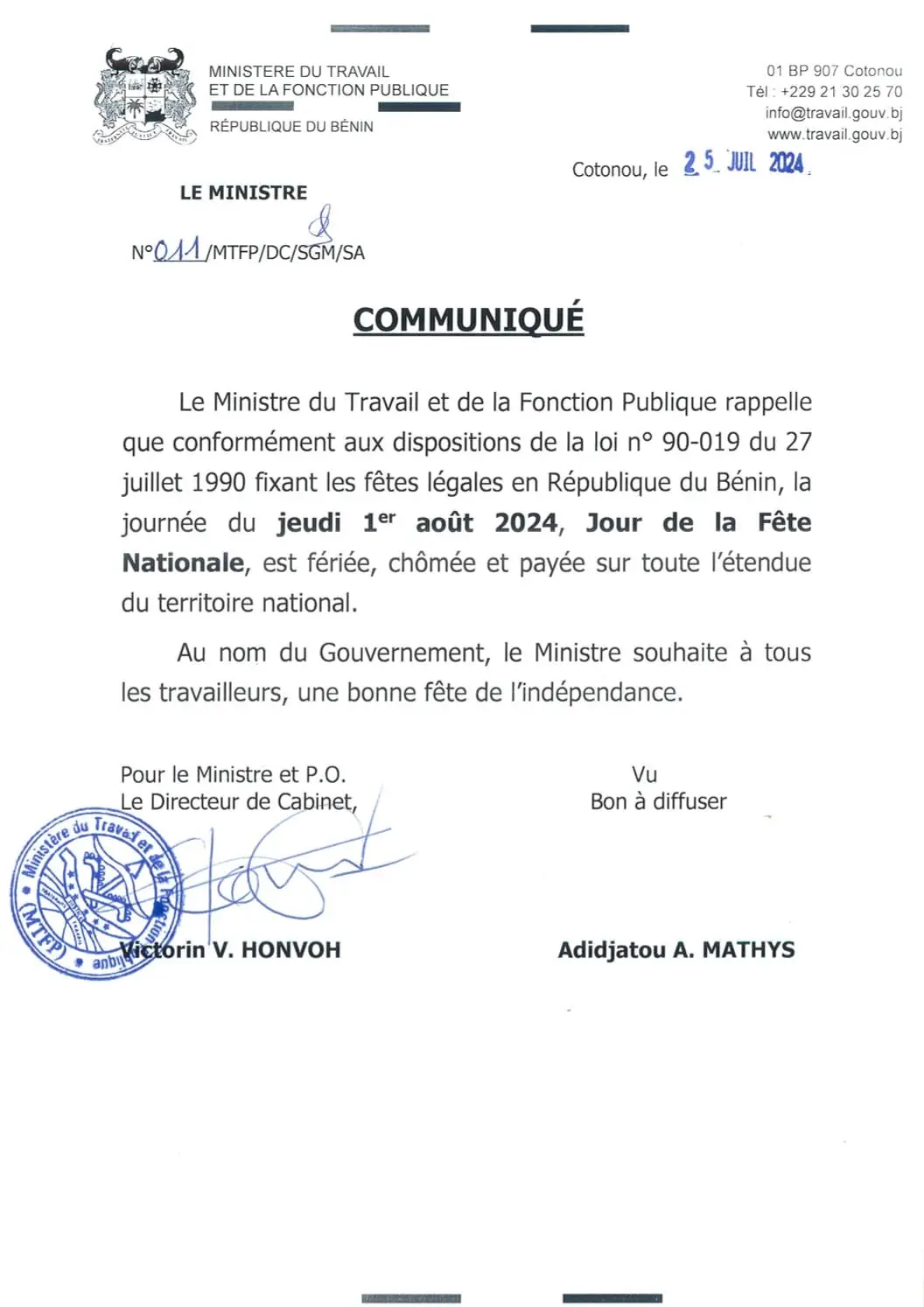 Bénin: la journée du jeudi 1er Aoà»t 2024 déclarée fériée, chômée et payée