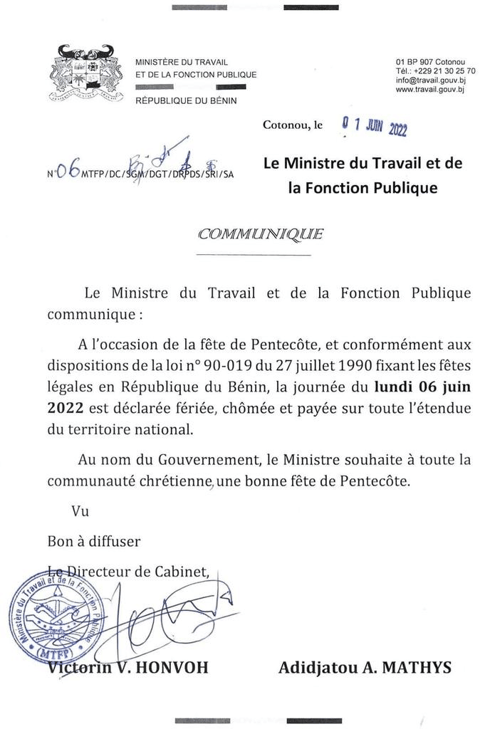 En raison de la célébration de la fête de Pentecôte, la journée du lundi 06 juin 2022 est déclarée fériée, chômée et payée.