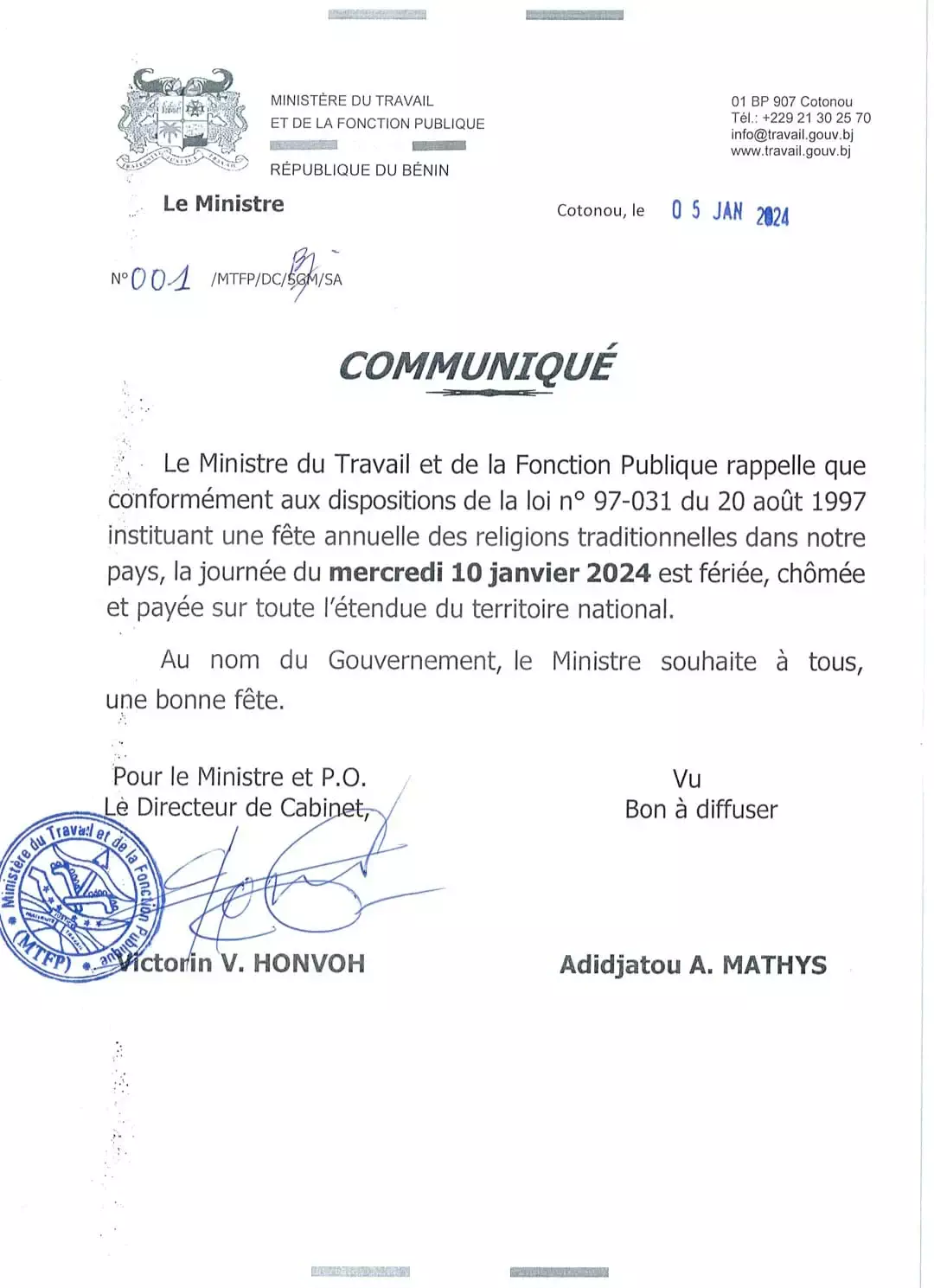 A l’occasion de la célébration de la fête annuelle des religions traditionnelles, la journée du mercredi 10 janvier 2024 est déclarée fériée, chômée et payée sur toute l’étendue du territoire national. Le Ministre du Travail et de la Fonction publique l’a fait savoir à travers un communiqué.