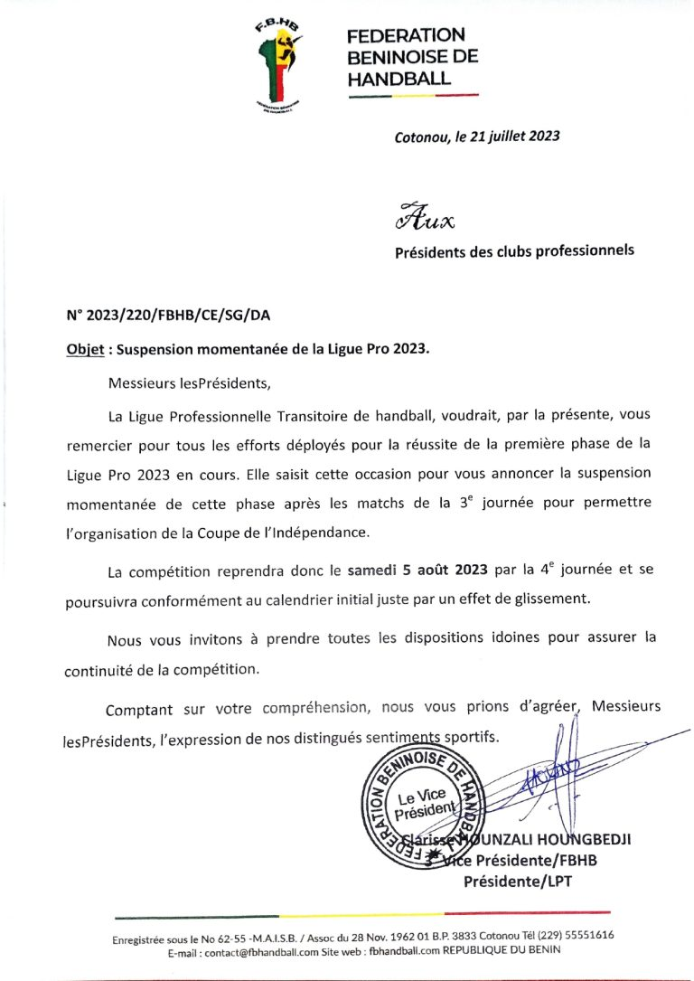 En raison de la fête de l’indépendance prévue au 1er août prochain, le championnat professionnel de handball est suspendu jusqu’au 5 août prochain, a annoncé la présidente de la Ligue professionnelle transitoire (Lpt), Clarisse Hounzali Houngbédji, dans un communiqué.