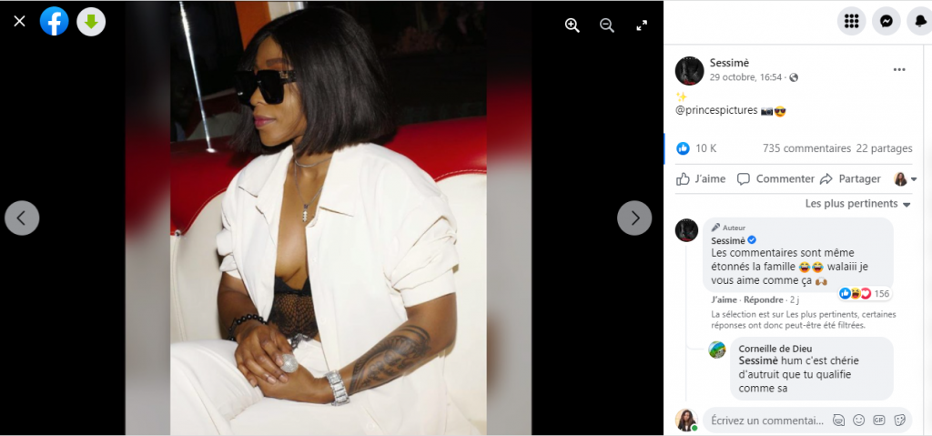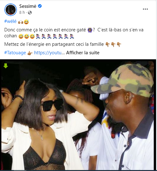 « Donc comme ça le coin est encore gâté? C’est là-bas on s’en va cohan (comme ça Ndlr). Mettez de l’énergie en partageant ceci la famille », a écrit Sessimè en légende du lien de son clip tatouage. Avant cette réaction, suite à la publication de la photo, la chanteuse avait réagi en commentaire aux critiques des internautes.