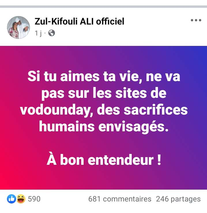 Dans son message, Zul-Kifouli Ali aurait averti le public de prétendus « sacrifices humains » lors de cet événement, suscitant potentiellement une panique parmi les citoyens. « Si tu aimes ta vie, ne va pas sur les sites de Vodun Days, des sacrifices humains envisagés. À bon entendeur ! », a-t-il écrit.
