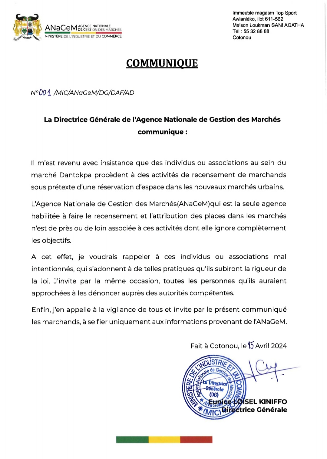Il m’est revenu avec insistance que des individus ou associations au sein du marché Dantokpa procèdent à des activités de recensement de marchands sous prétexte d’une réservation d’espace dans les nouveaux marchés urbains, peut- on lire dans le communiqué.