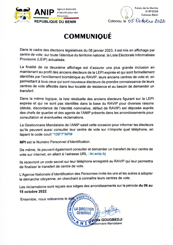 L’annonce a été faite ce mercredi 5 Octobre 2022 par le mandataire délégué de l’agence nationale d’identification des personnes (ANIP), Dr Cyrille Gougbédji. Selon ledit communiqué, les réclamations issues de la consultation de la liste seront reçues aux sièges des arrondissements sur la période du Jeudi 06 au Samedi 15 Octobre 2022.