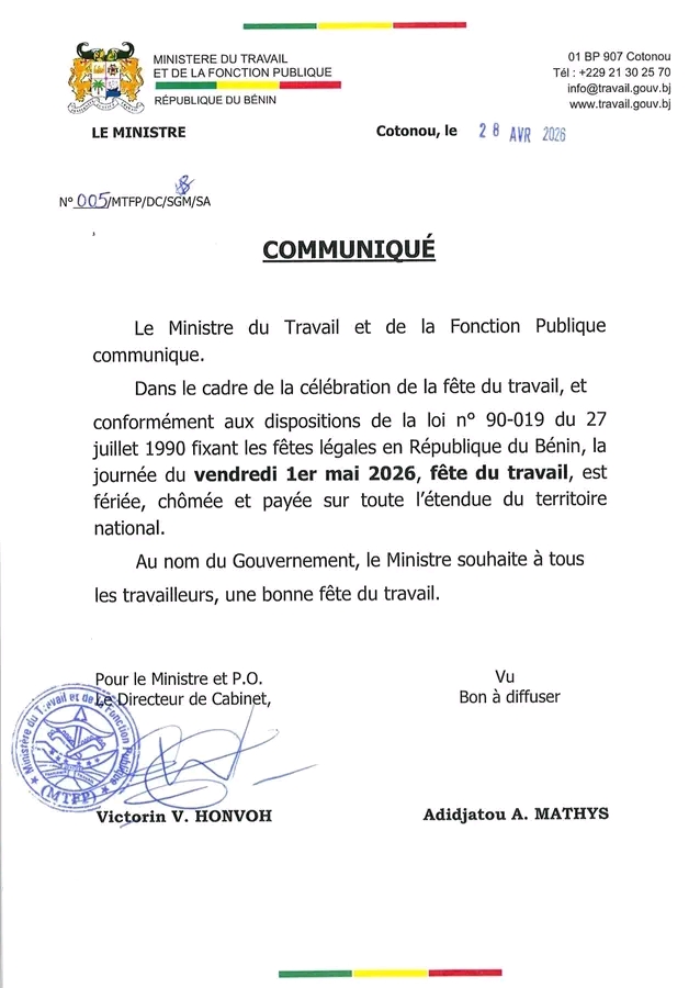 Dans un communiqué en date du 28 avril 2026, le ministre a rappelé que cette décision s’inscrit dans le respect de la loi n° 90-019 du 27 juillet 1990, qui fixe les fêtes légales en République du Bénin. Ainsi, tous les travailleurs, qu’ils soient du secteur public ou privé, bénéficieront de cette journée de repos rémunéré.
