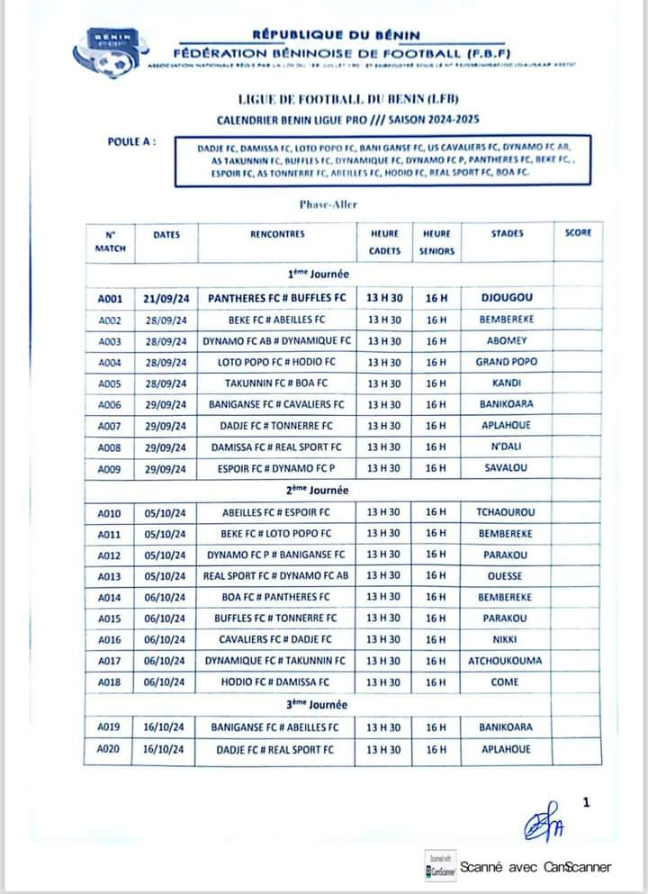 Découvrez le calendrier de la saison 2024-2025 du championnat professionnel de football du Bénin. La campagne s’ouvre le 21 septembre prochain, avec au coup d’envoi, un choc entre les Panthères et les Buffles à Djougou.