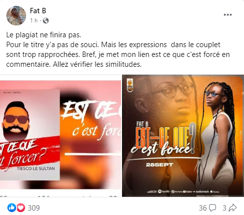 Dans un court message sur sa page Facebook, la jeune rappeuse Béninoise Fat B a dénoncé une grande similitude entre son single « est-ce que c’est forcé » et celui de Tiesco Le Sultan portant le même nom.