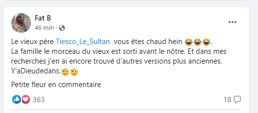 Après quelques recherches, Fat B s’est rendu compte que son morceau « Est-ce que c’est forcé » est sorti après celui du chanteur ivoirien Tiesco Le Sultan. « La famille le morceau du vieux est sorti avant le nôtre. Et dans mes recherches j’en ai encore trouvé d’autres versions plus anciennes », a-t-elle clarifié. C’est ce qui visiblement explique la suppression de la publication de sa page Facebook.