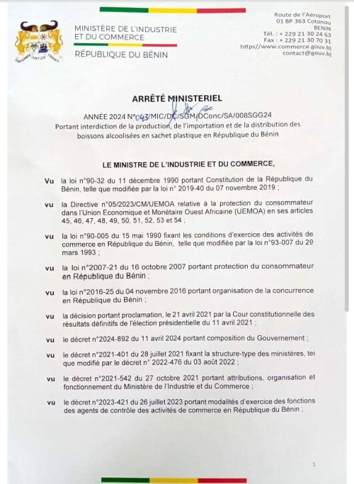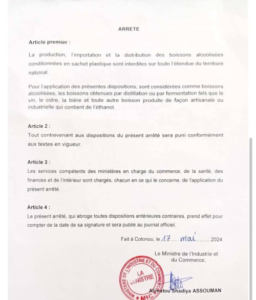 A travers un arrêté signé du ministre de l’industrie et du commerce (MIC), Madame Alimatou Shadiya Assouman, le gouvernement béninois vient d’interdire la production, l’importation, la distribution et le conditionnement des boissons alcoolisées en sachet.
