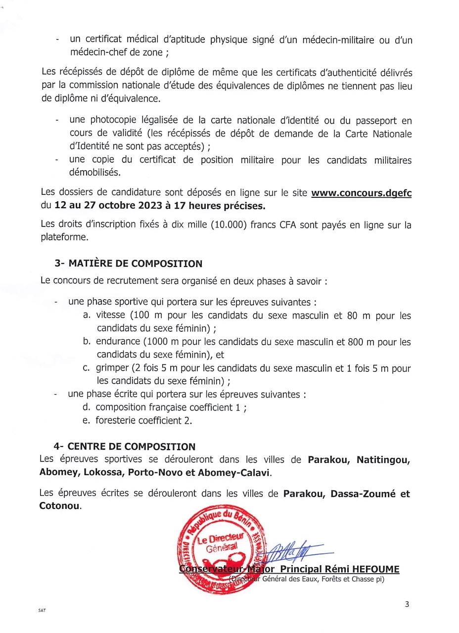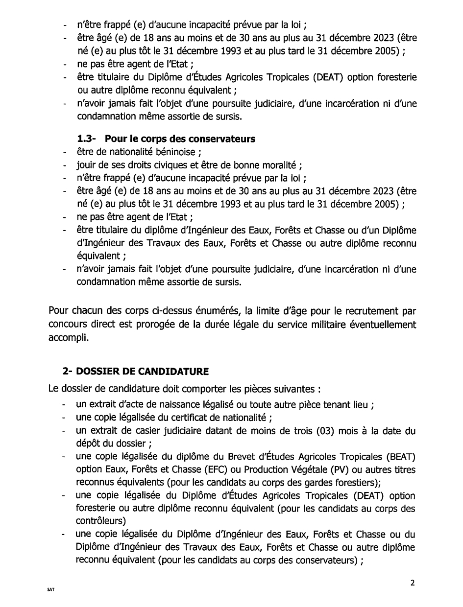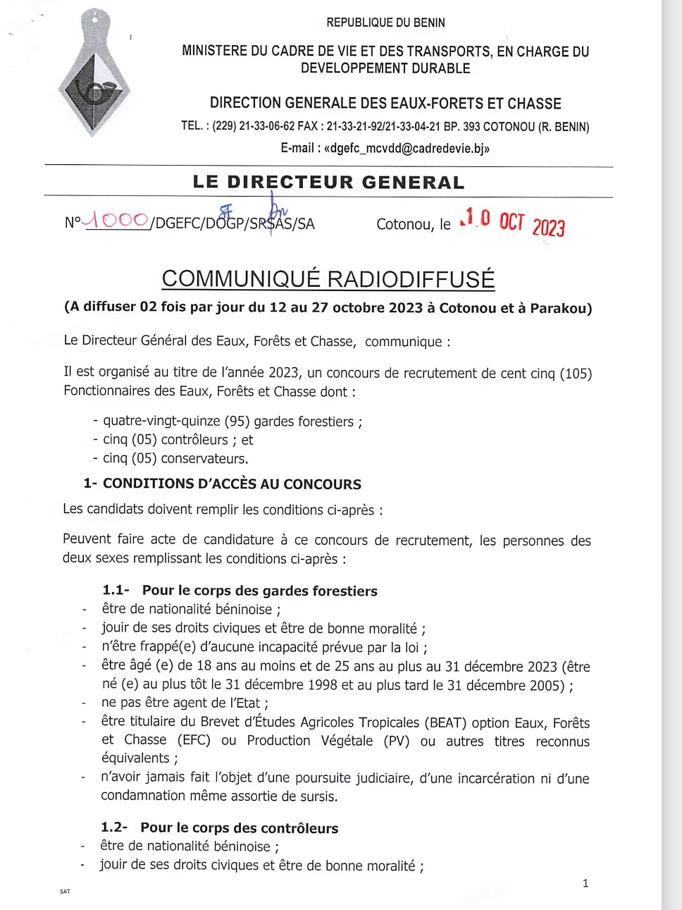 Au titre des 105 fonctionnaires à recruter, il y a 95 gardes forestiers, 5 contrôleurs et 5 conservateurs. Les conditions pour participer à ce concours de recrutement se présentent comme suit :