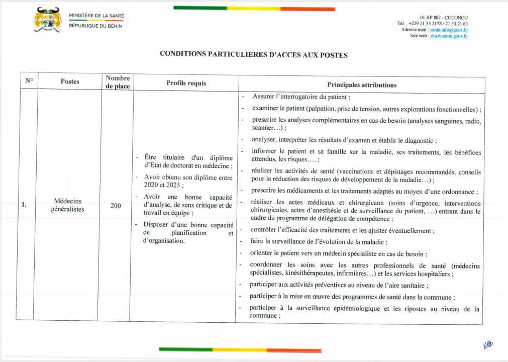Le gouvernement lance le recrutement de 550 professionnels de santé dans trois domaines. Les dossiers de candidatures doivent être envoyés en ligne pendant la période allant du 11 au 25 sur la plateforme https://emploisante.gouv.bj/.