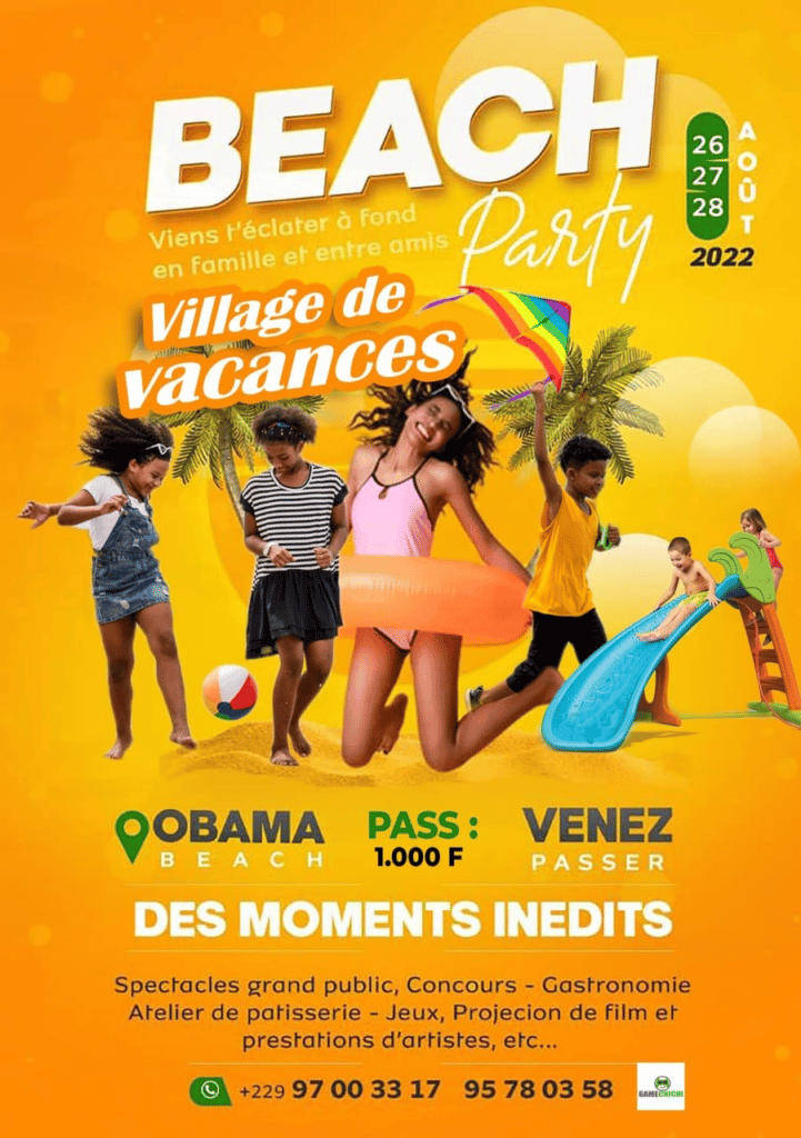 Les 26, 27 et 28 août 2022, s’organise un grand village de vacances à Obama Beach à partir de 9h. L’objectif de ce village dit de vacances est de faire passer de très belles vacances aux enfants, aux jeunes, aux adultes, à tout le monde et particulièrement à 200 orphelins qui sont les invités d’honneur sur cet événement.