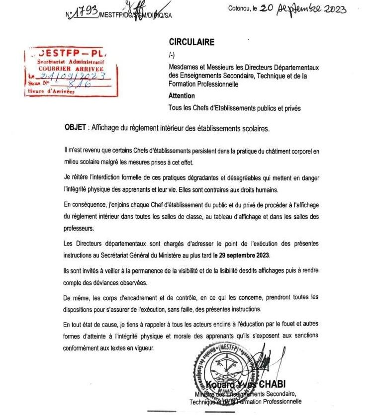 Par ailleurs, le ministre Yves Chabi Kouaro invite les chefs d’établissements du public et du privé « à procéder à l’affichage du règlement intérieur dans toutes les salles de classe, au tableau d’affichage et dans les salles des professeurs ».