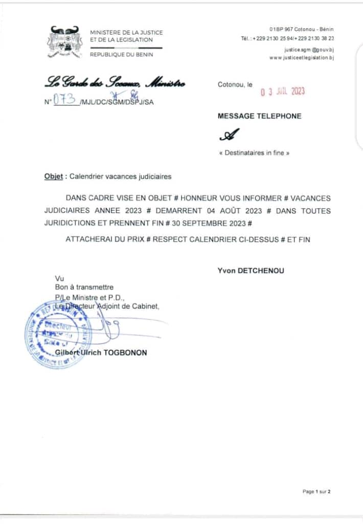 C’est à travers un message téléphone en date à Cotonou du 3 juillet que le ministre Yvon Détchénou a révélé le calendrier des vacances judiciaires. Selon ledit message téléphone, les vacances judiciaires vont se dérouler du vendredi 4 Août au 30 septembre 2023.