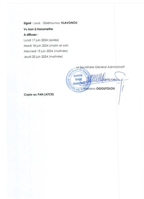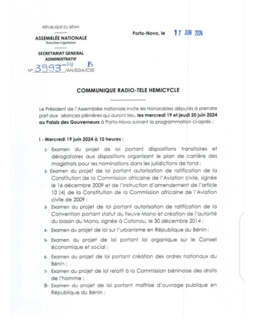 Le président de l’Assemblée nationale Louis Vlavonou exhorte les députés à participer aux séances plénières prévues les mercredi 19 et jeudi 20 juin 2024 au Palais des Gouverneurs à Porto-Novo. Cette invitation est mentionnée dans un communiqué officiel daté du 17 juin 2024.