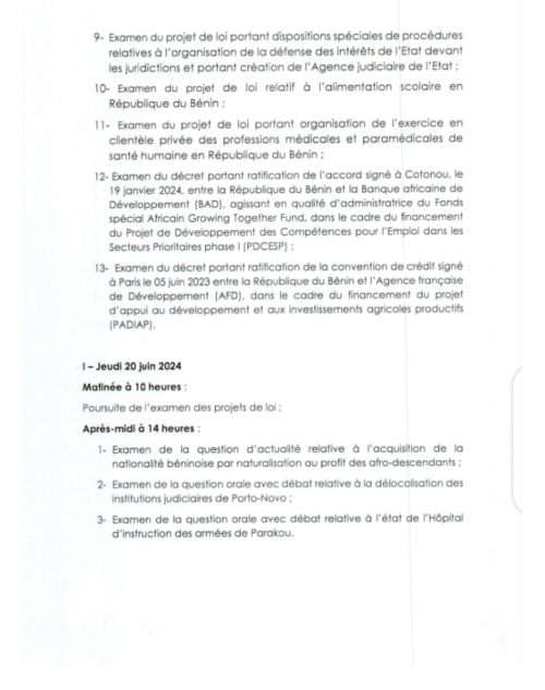 Ainsi, 11 projets de loi seront examinés le mercredi. L’examen de ces projets de loi vont se poursuivre dans la matinée du jeudi. L’après-midi du jeudi sera consacré à l’examen de la question d’actualité concernant l’acquisition de la nationalité béninoise par naturalisation au profit des Afro-descendants, ainsi qu’à l’examen de la question orale avec débat portant sur la délocalisation des institutions judiciaires de Porto-Novo et l’état de l’Hôpital d’instruction des armées.