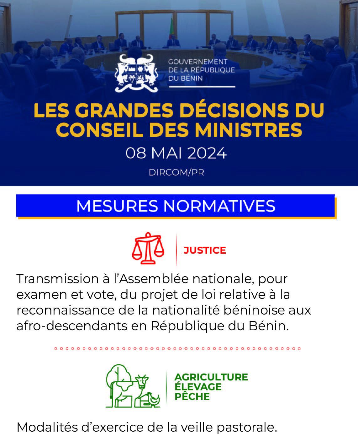 Le Conseil des ministres s’est tenu ce mercredi 08 Mai 2024 au Palais de la Marina sous la présidence du Chef de l’Etat, le président Patrice Talon. Les décisions ci après ont été prises: