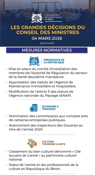 Au Bénin, le gouvernement dirigé par le président Patrice Talon s’est réuni ce mercredi 04 mars 2026 en conseil des ministres au Palais de la Marina . A cet effet, plusieurs décisions ont été prises.
