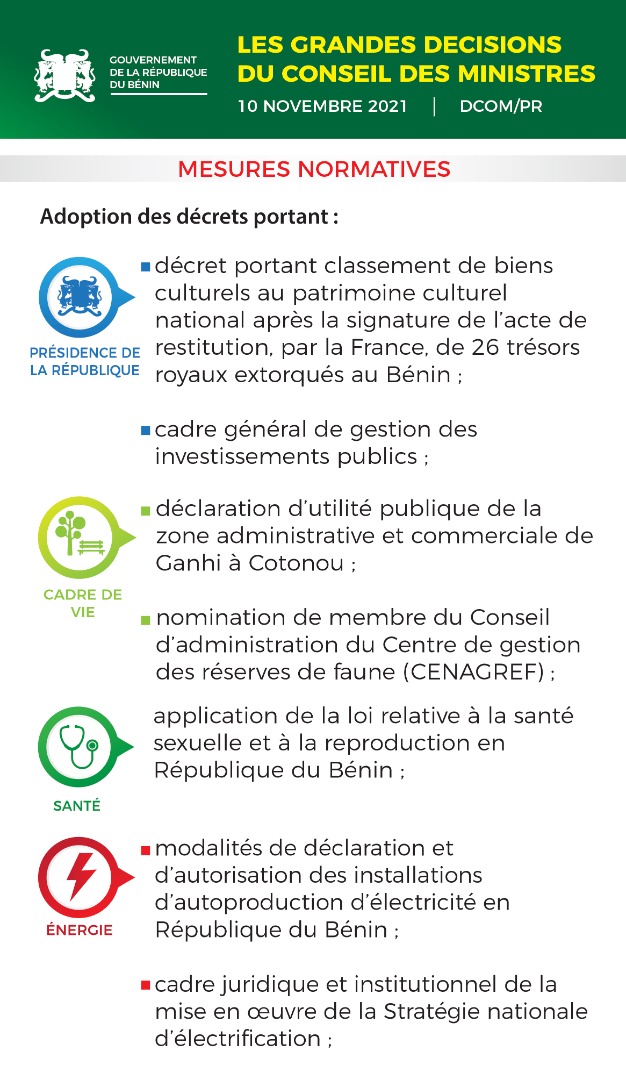 Bénin: les grandes décisions du Conseil des ministres du 10 novembre 2021