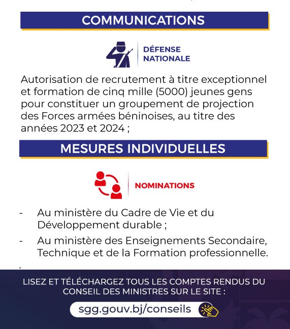Autorisation de recrutement à titre exceptionnel et formation de cinq mille (5000) jeunes gens pour constituer un groupement de projection des Forces armées béninoises, au titre des années 2023 et 2024.
