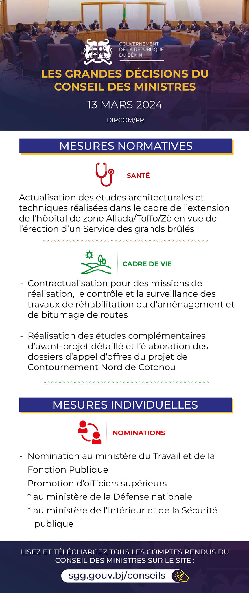 Les membres du gouvernement se sont réunis en conseil des ministres ce mercredi 13 mars 2024. Les décisions ci-après ont été prises: