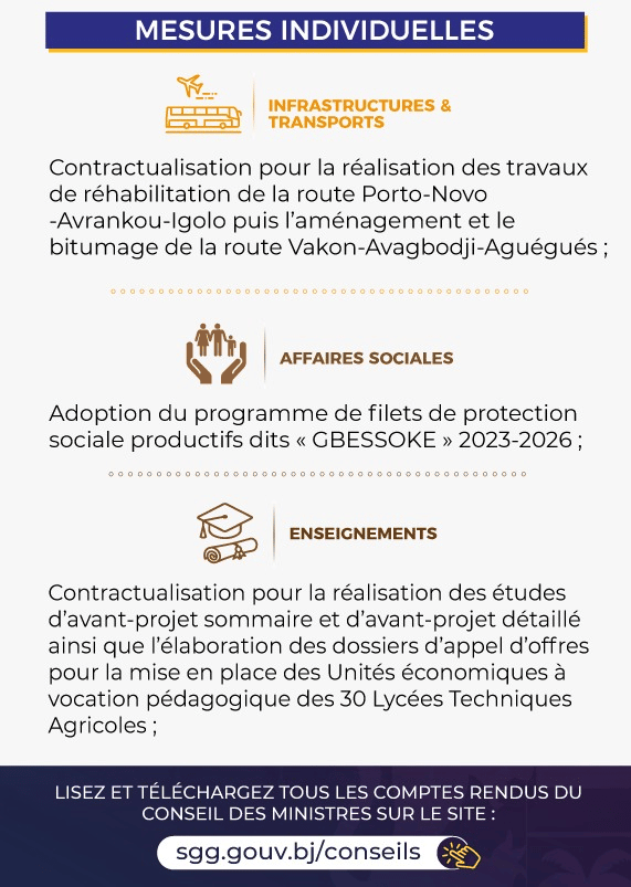 - Adoption du programme de filets de protection sociale productifs dits « GBESSOKE » 2023-2026 ;