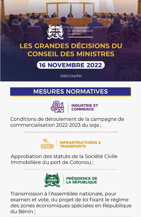 Bénin: les grandes décisions du Conseil des ministres du 16 novembre 2022