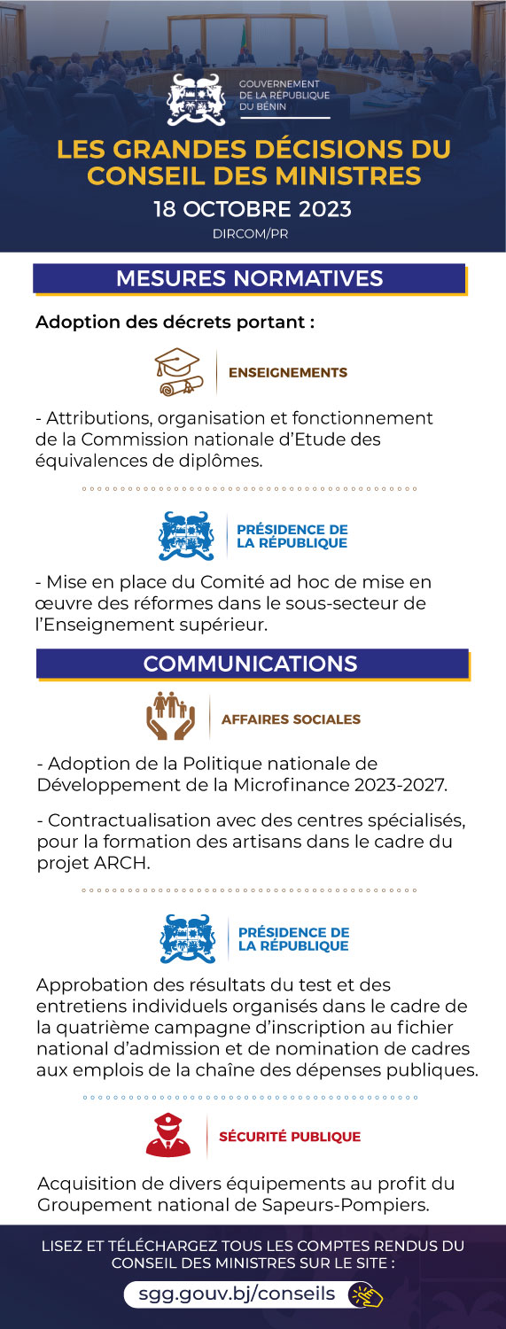 Retrouvez ci-dessous, les grandes lignes du Conseil des ministres tenu ce mercredi 18 octobre 2023, sous la présidence effective du président Patrice Talon.
