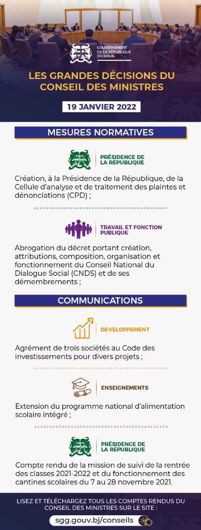 Bénin: les grandes décisions du Conseil des ministres du 19 janvier 2022