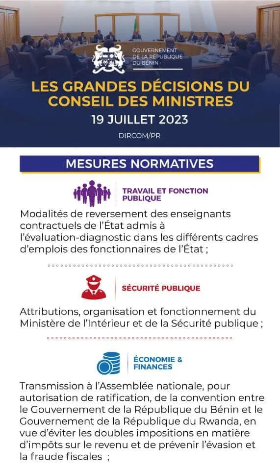 Bénin: les grandes décisions du Conseil des ministres du 19 juillet 2023