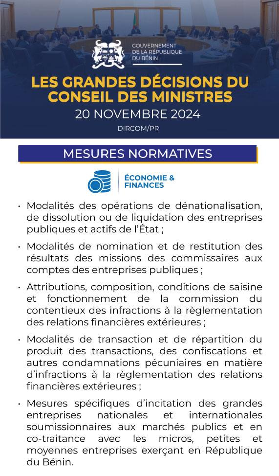 Le Conseil des Ministres s’est réuni mercredi, le 20 novembre 2024, sous la présidence de Monsieur Patrice Talon, Président de la République, Chef de l’État, Chef du Gouvernement. Les décisions ci-après ont été prises: