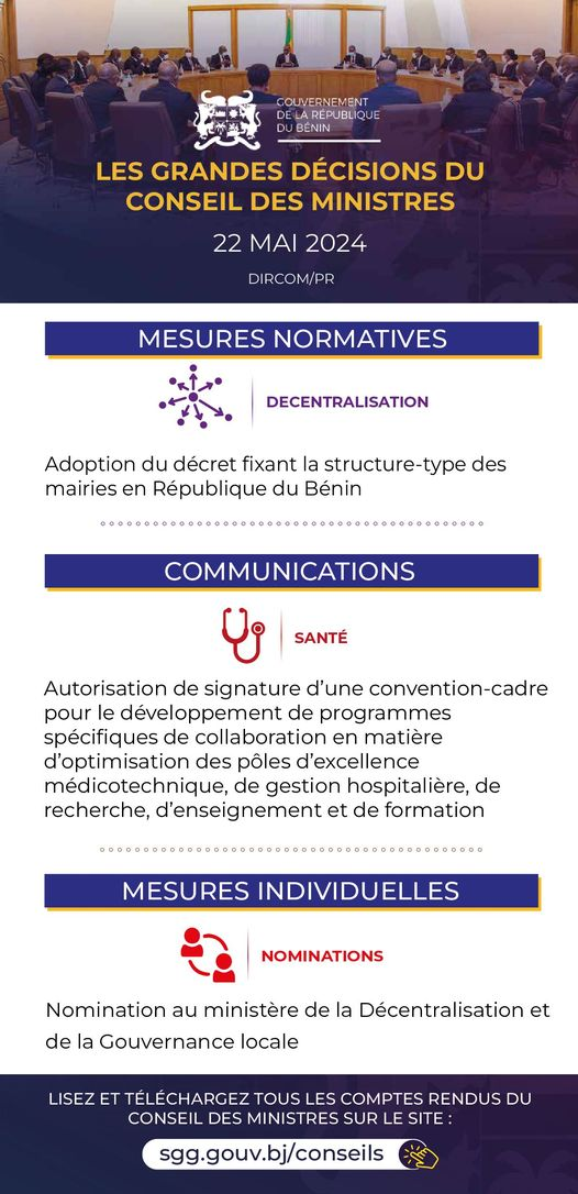 Le Conseil des ministres s’est tenu ce mercredi 22 mai 2024 au Palais de la Marina sous la présidence du Chef de l’Etat, le président Patrice Talon. Les décisions ci après ont été prises: