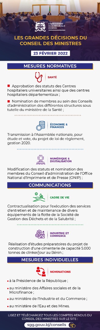 Bénin: les grandes décisions du Conseil des ministres du 23 février 2022