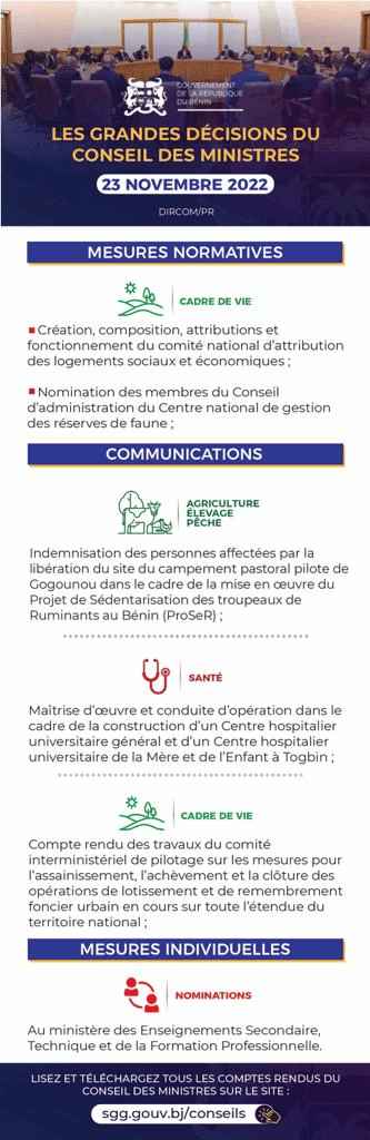 Bénin: les grandes décisions du Conseil des ministres du 23 novembre 2022