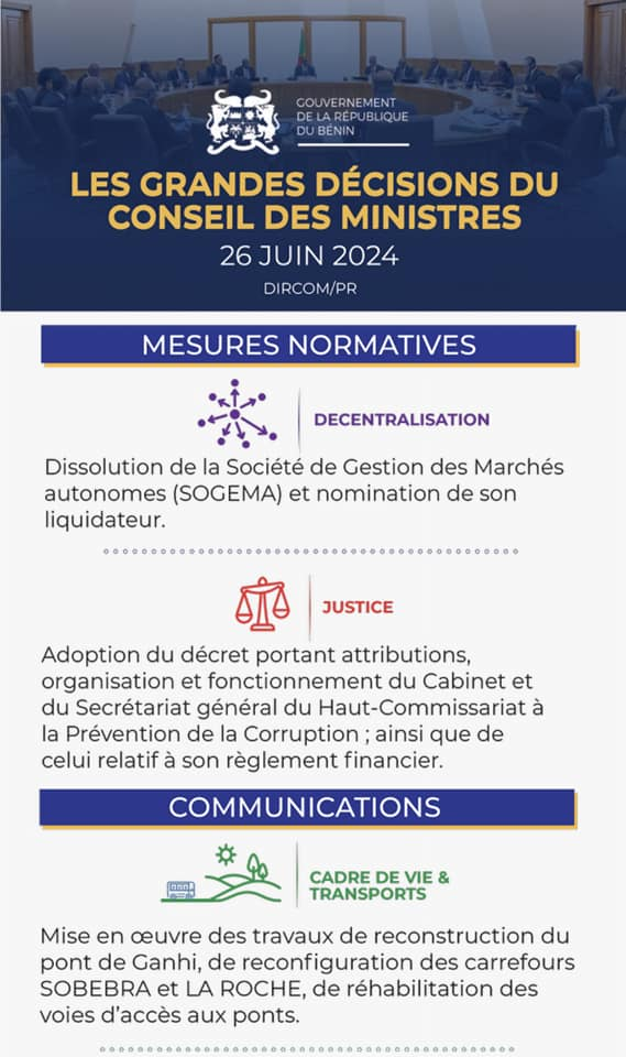 Le conseil des ministres s’est tenu ce mercredi 26 juin 2024 sous la présidence de Patrice Talon. Les décisions ci-après ont été prises.