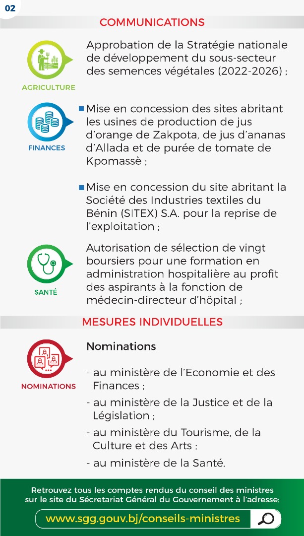 - Mise en concession du site abritant la Société des Industries textiles du Bénin (SITEX) S.A. pour la reprise de l’exploitation ;
