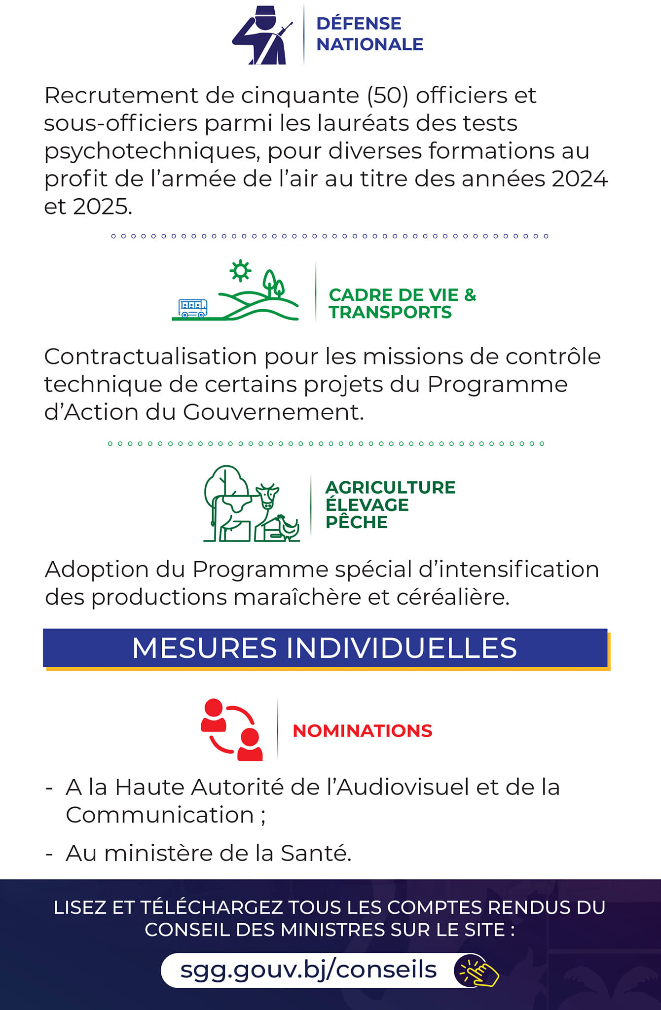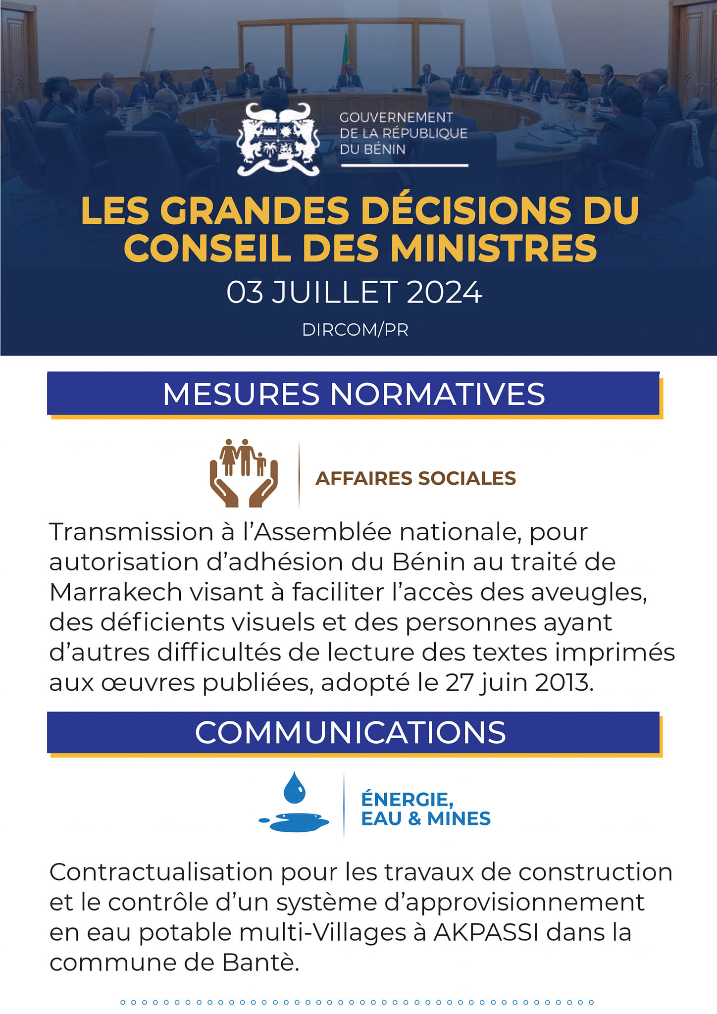 Le conseil des ministres s’est réuni ce mercredi 3 juillet 2024 sous la présidence de Patrice Talon. Les décisions ci-après ont été prises: